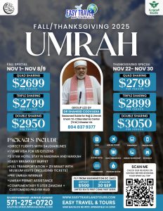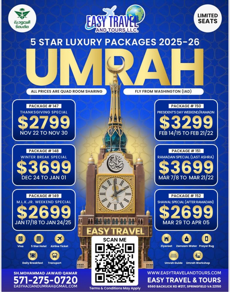 Easy Travel And Tours has been in the service of pilgrims hailing from the USA and Canada for more than two decades. Our experience in Hajj, Umrah, and Tour packages make us the best choice out of all the operators. We also strongly believe that being a Hajj and Umrah operator is more an Ibad’ah than business. Whether you are going for Hajj, Umrah or for Tours, we feel that we have a duty to perform from the time that you book with us till you are back home. That is why we take special care in not only designing our Hajj and Umrah packages but also in booking them.